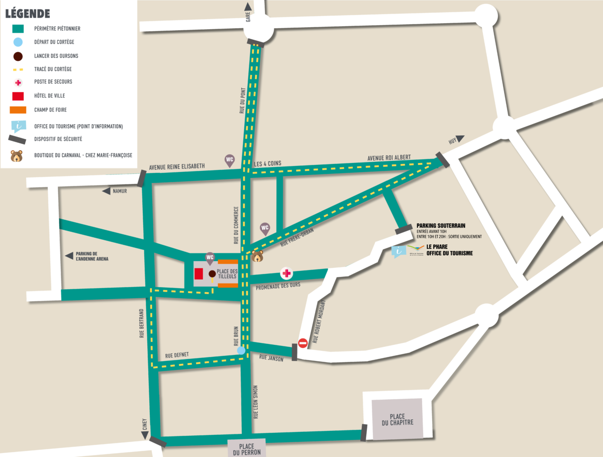 Le 15 mars, le cortège empruntera les rues suivantes : rue Brun – rue du Commerce – rue du Pont – Avenue Roi Albert – rue Frère-Orban – Place des Tilleuls – rue Brun – rue Defnet – rue Bertrand – Place des Tilleuls