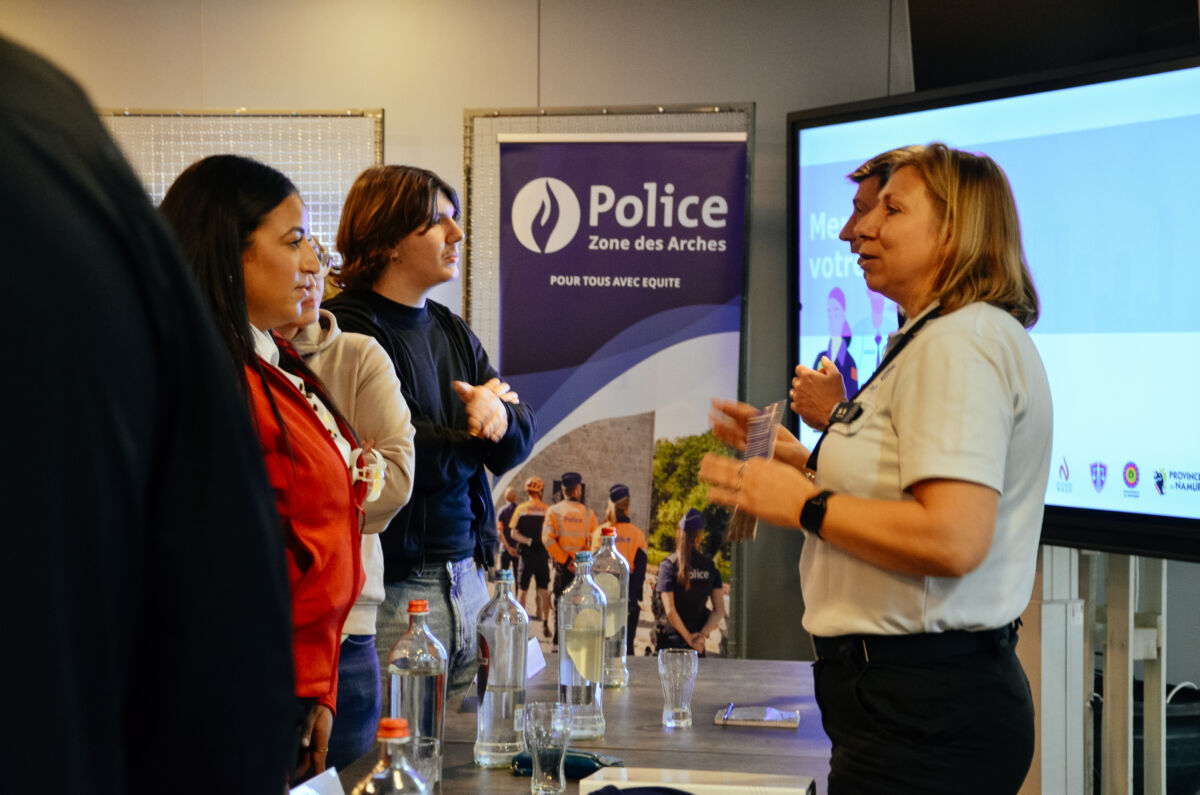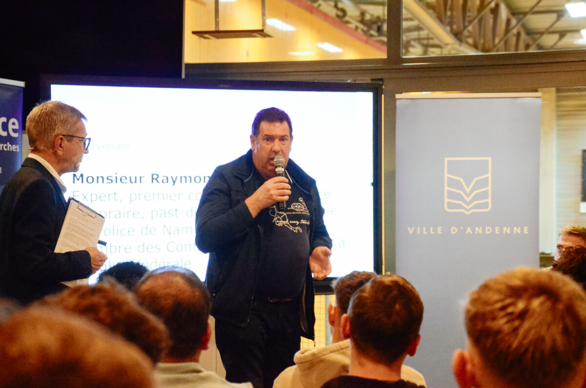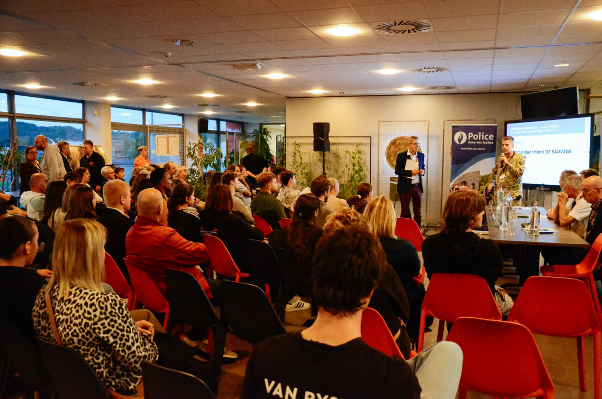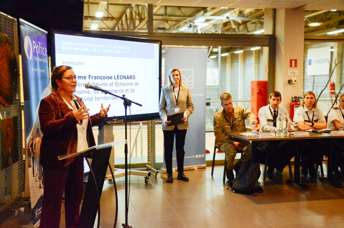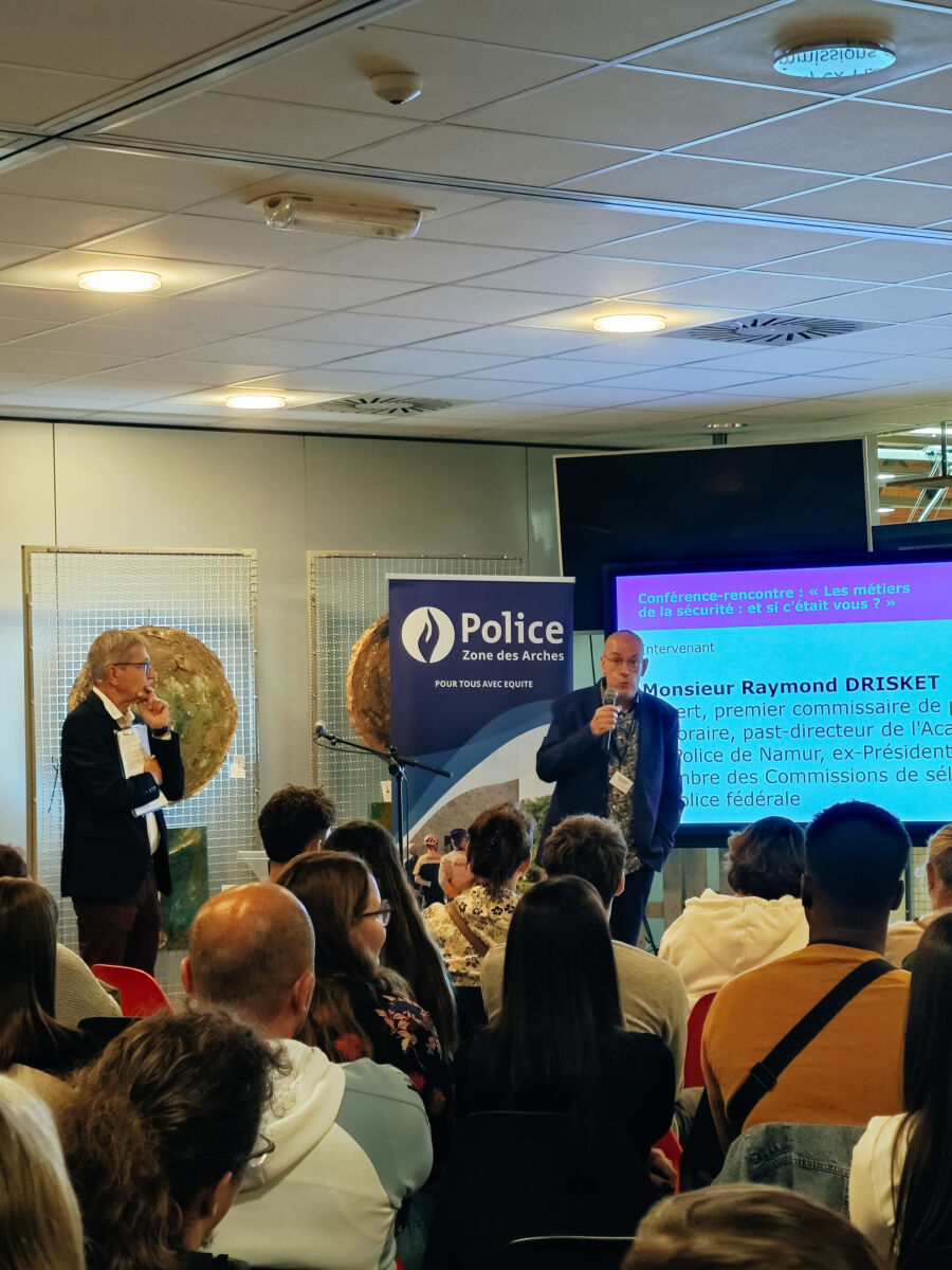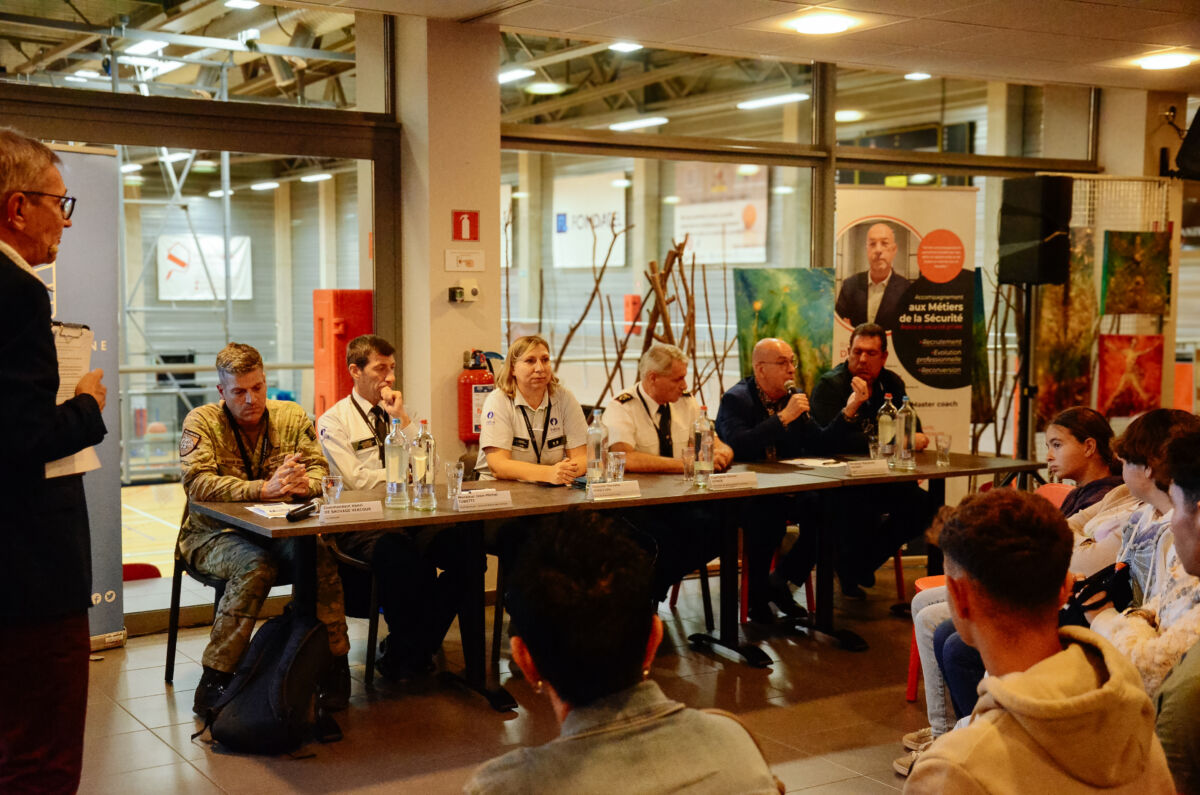 La conférence a été animée par le journaliste Benoît De Rue et a réuni des intervenants de qualité : un représentant de la Zone de secours NAGE, une représentante de la Zone de Police des Arches, un représentant de la Défense et un Master Coach spécialisé dans les métiers de la sécurité.